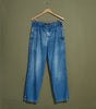 For an easy modern look, start with an oversized pair of jeans. Then cinch the waist with something simple like a shoestring.